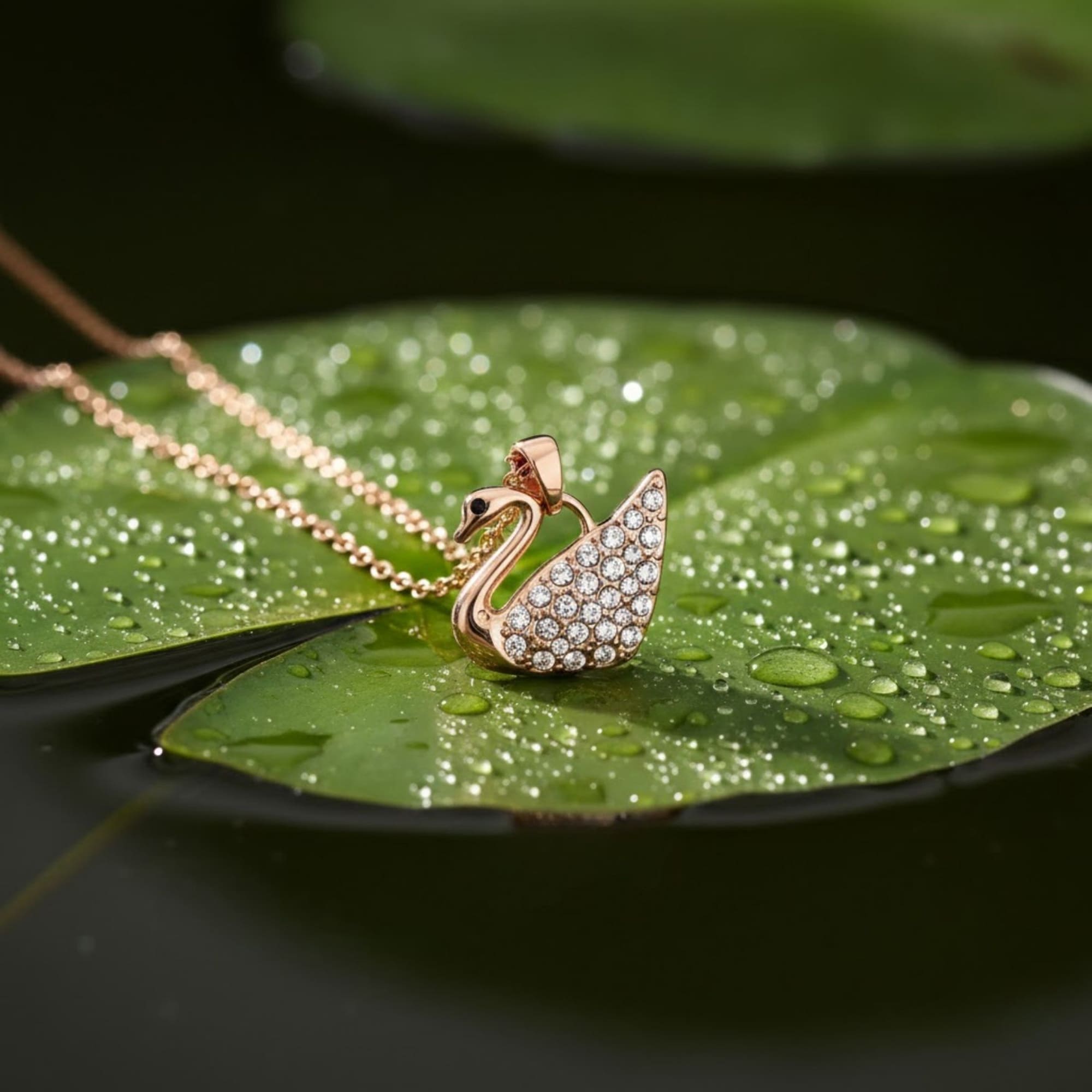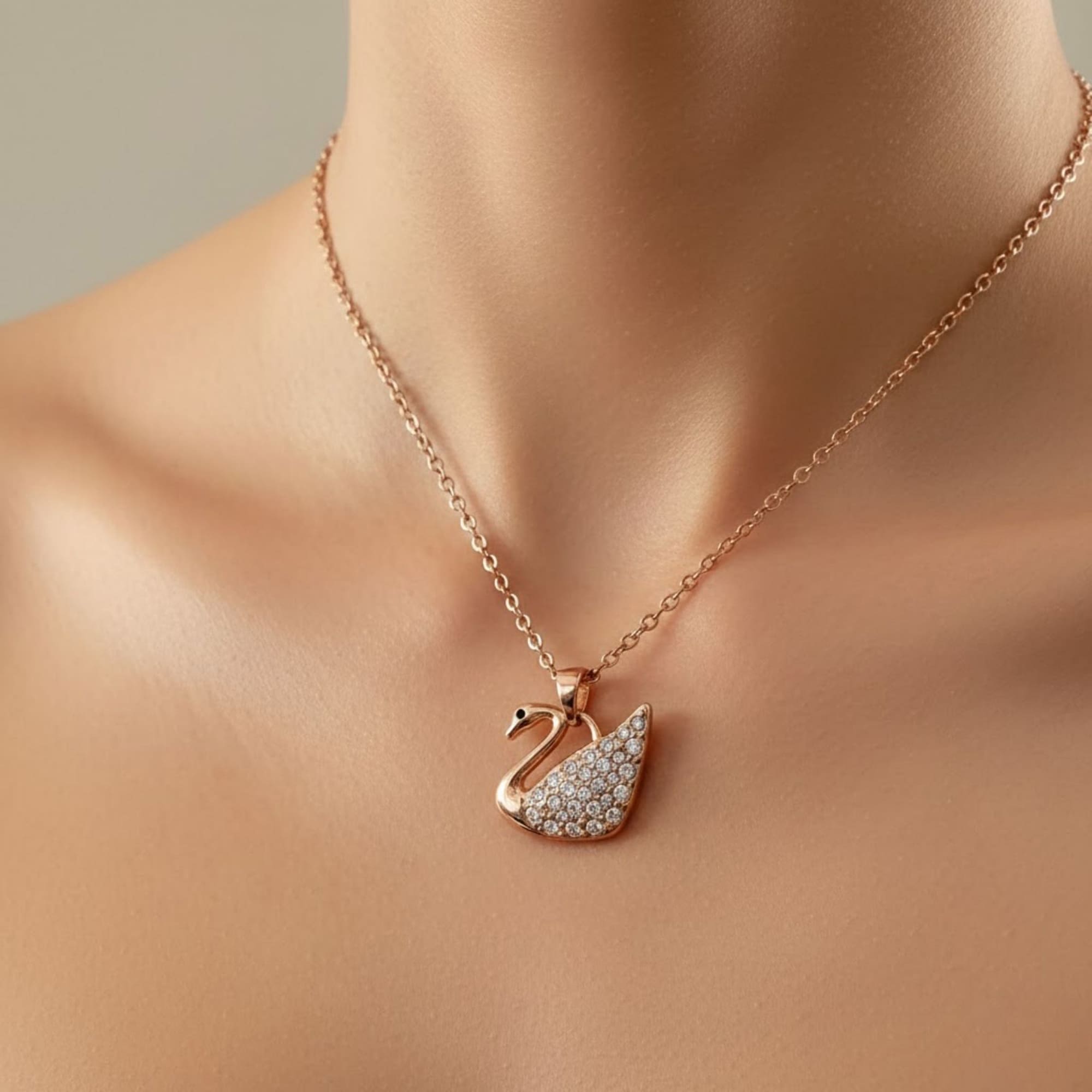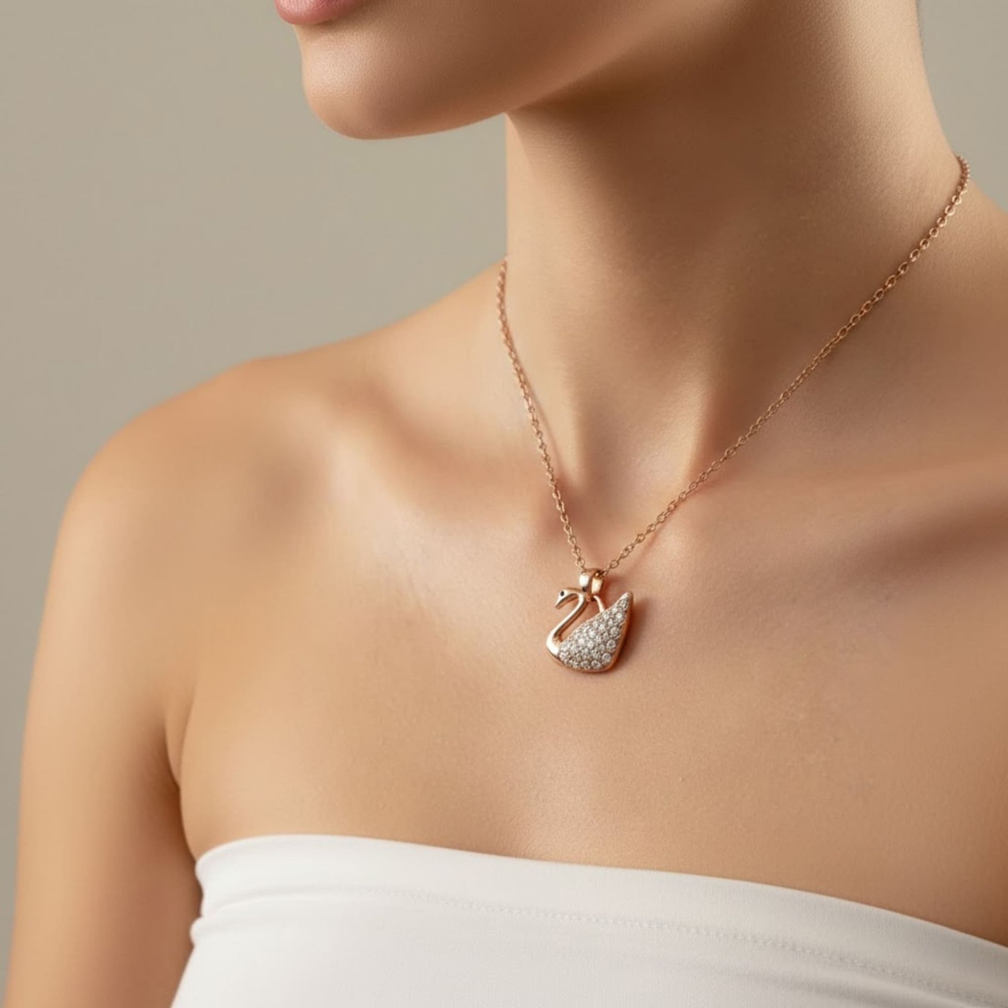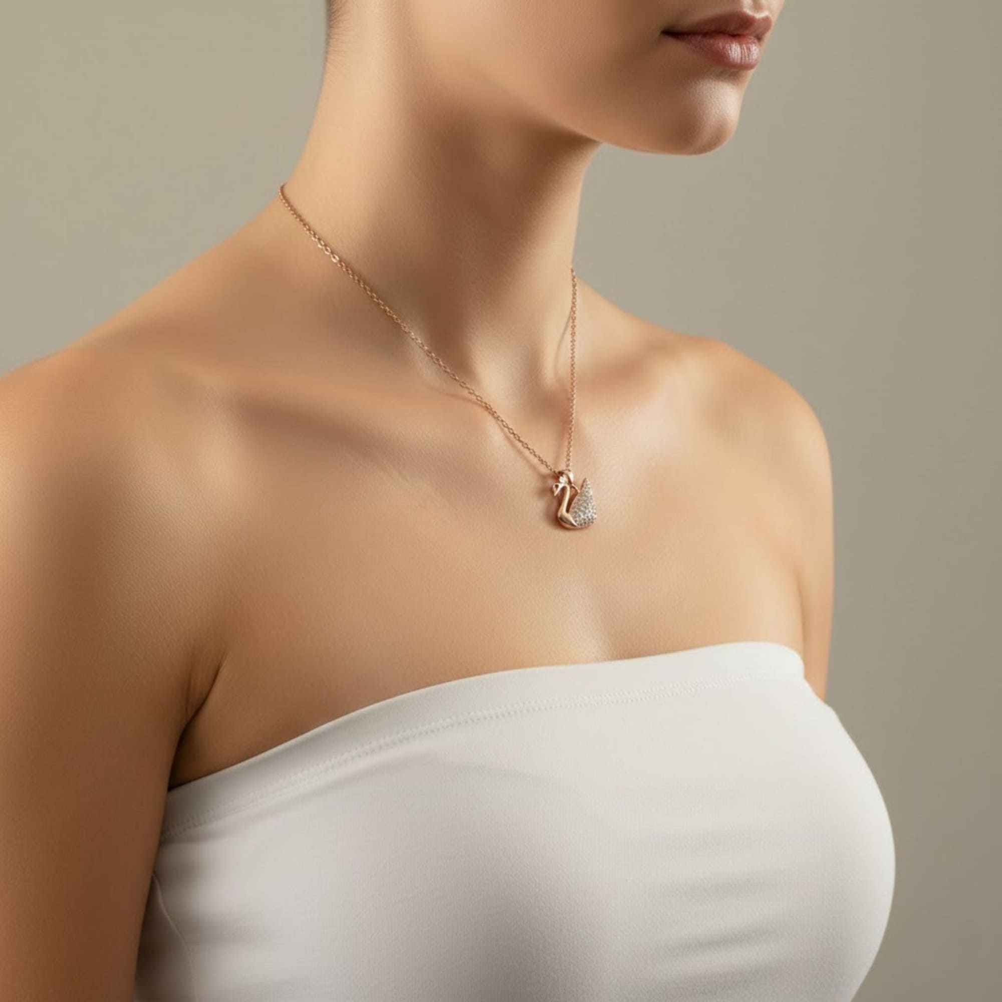 This glamorous necklace features a wonderful swan design adorned with gleaming clear Crystals from SWAROVSKI® The necklace is finely made from alloy verlay with 18K Rose Gold. A timeless & Elegant SWAROVSKI® Swan Piece.