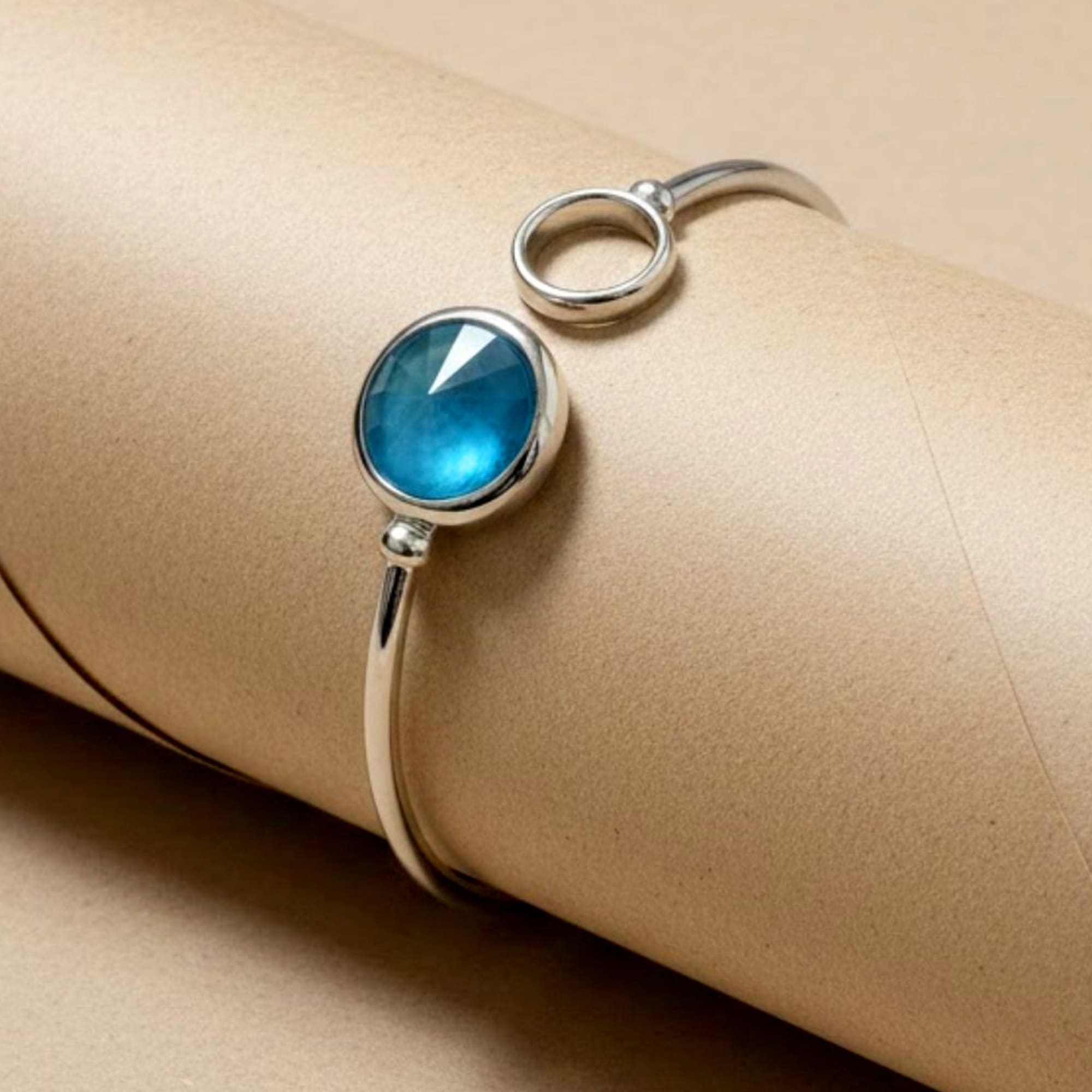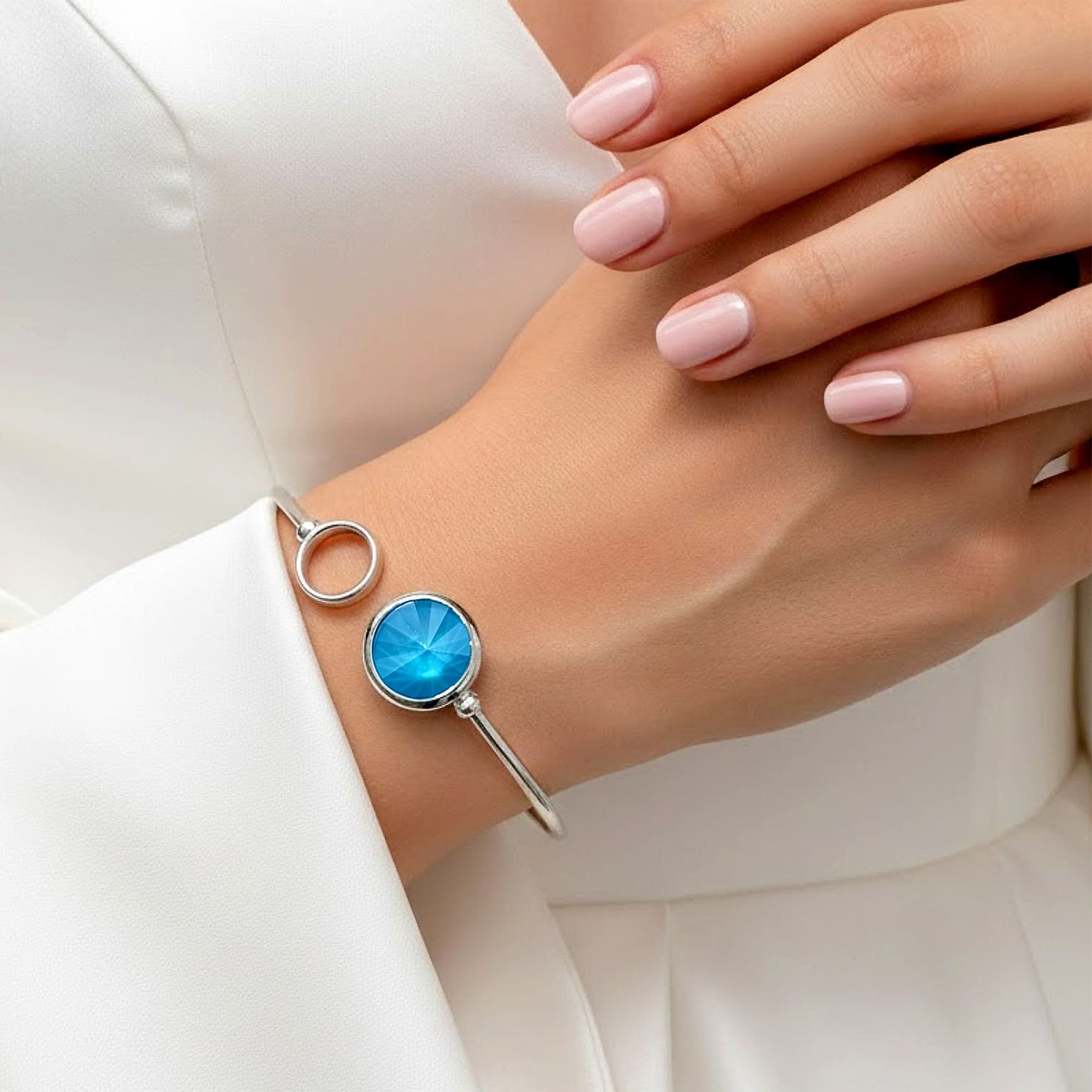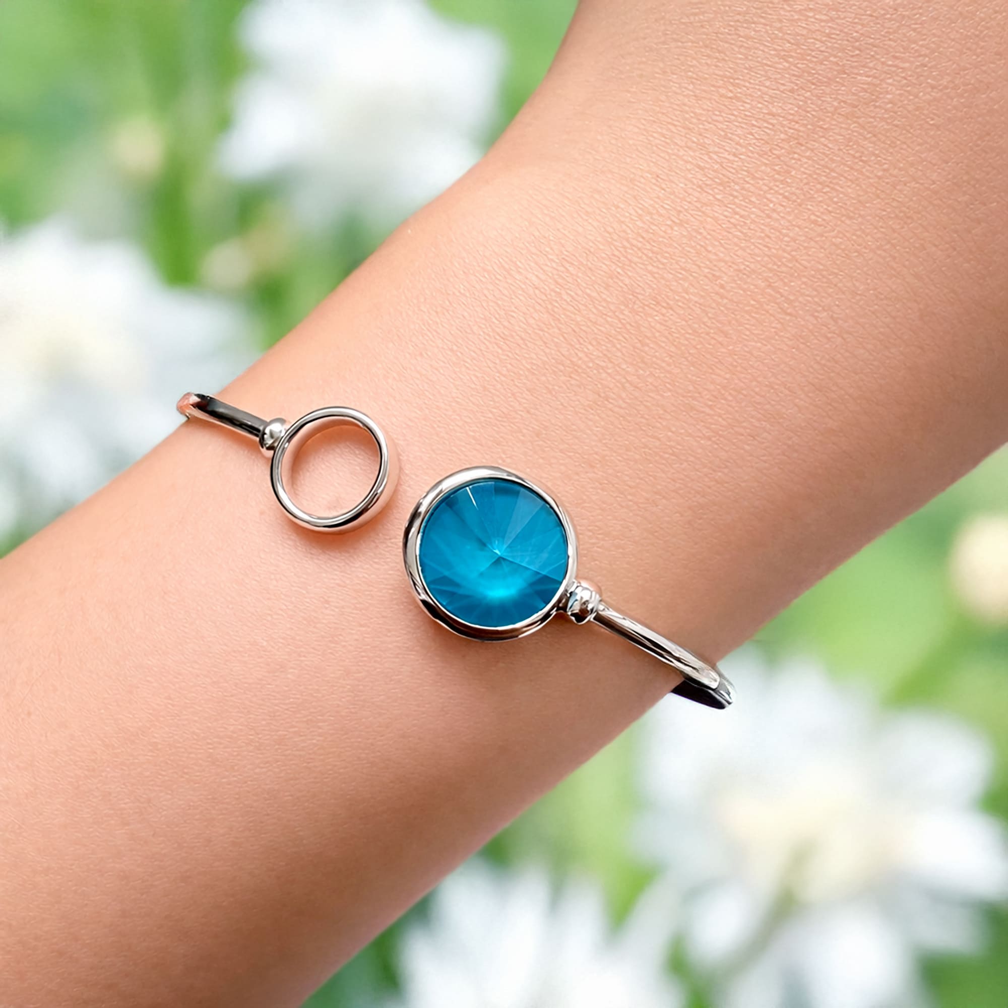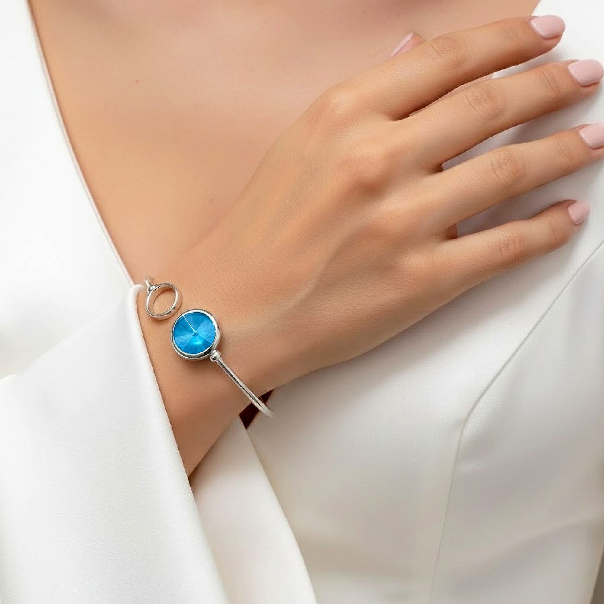 This gorgeous open bangle is set with a beautiful round-cut, bezel-set crystal made with SWAROVSKI® element. This ultra feminine style bangle is made of 18K White Gold plated alloy. A high polish finish completes the look of this bangle with a radiant shine. A graceful and elegant beauty! This gorgeous bangle is made in Korea.